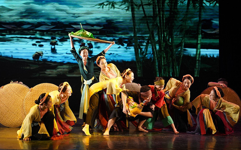 Hóa thân thành những nhân vật xưa với những điệu múa uyển chuyển, kết hợp đạo cụ như quạt, dù, lụa trên nền nhạc mang âm hưởng truyền thống.
